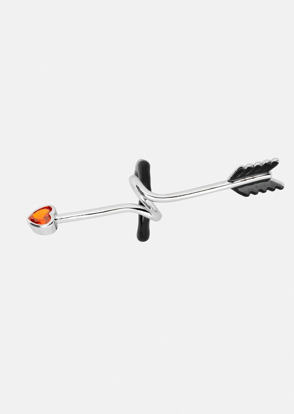 The Cigarette Ring wraps a silver arrow around the finger, tipped with a heart cut crystal on one end and finished with glossy black enamel fletching on the other. The sculptural design rests on a black enamel shank  and yes, it doubles as a cigarette holder.